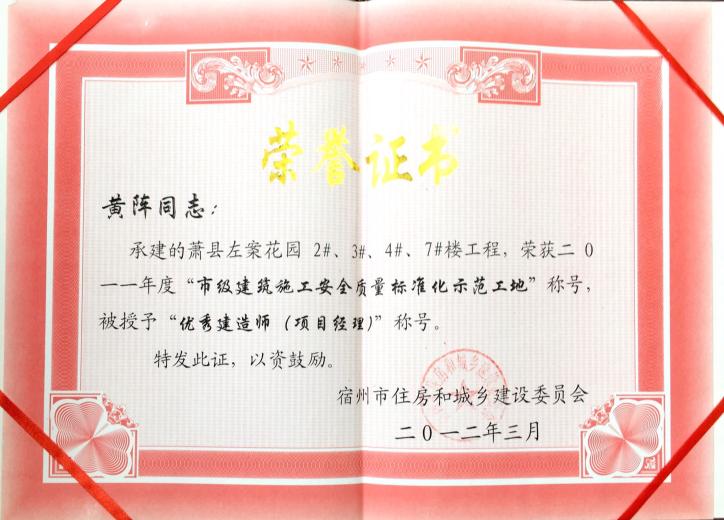 >黄阵承建——萧县左岸花园2#、3#、4#、7#楼工程被授予优秀建造师(项目经理)