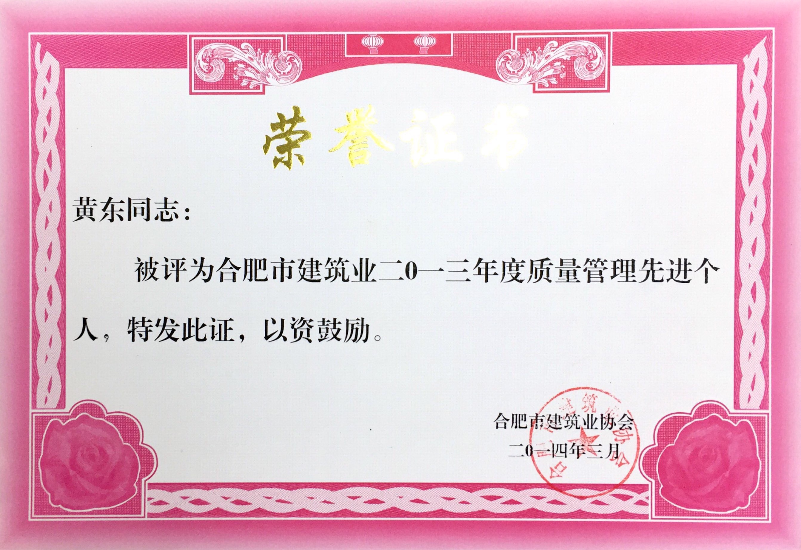 >合肥市建筑业2013年度质量治理先进个人——黄东