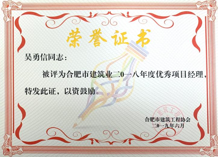 >合肥市建筑业2018年度优秀项目经理——吴勇信