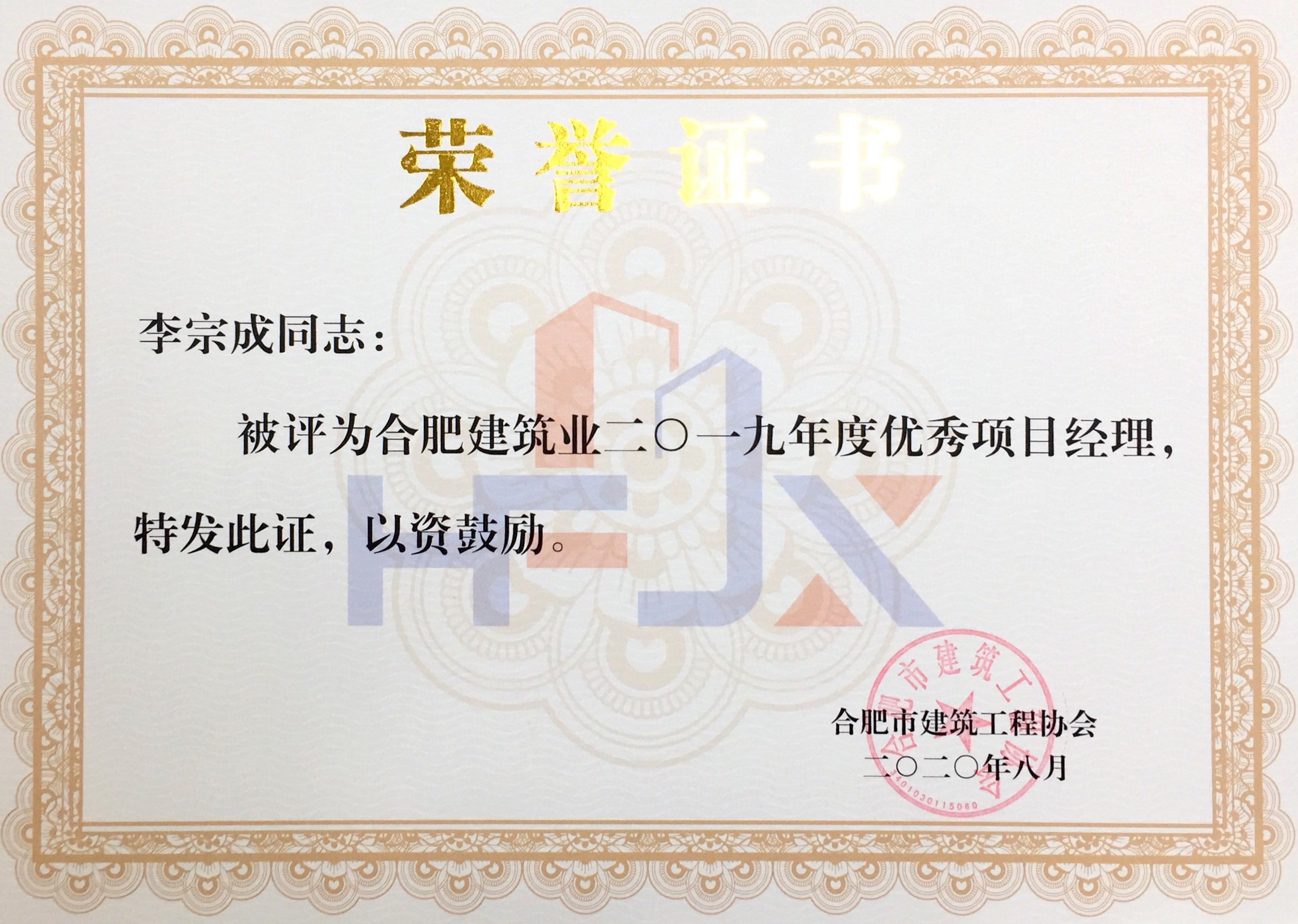 >合肥市建筑业2019年度优秀项目经理——李宗成
