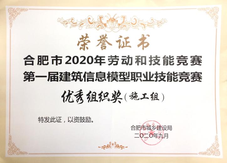 >合肥市2020年劳动和技术竞赛第一届建筑信息模型职业技术竞赛优秀组织奖(施工组)