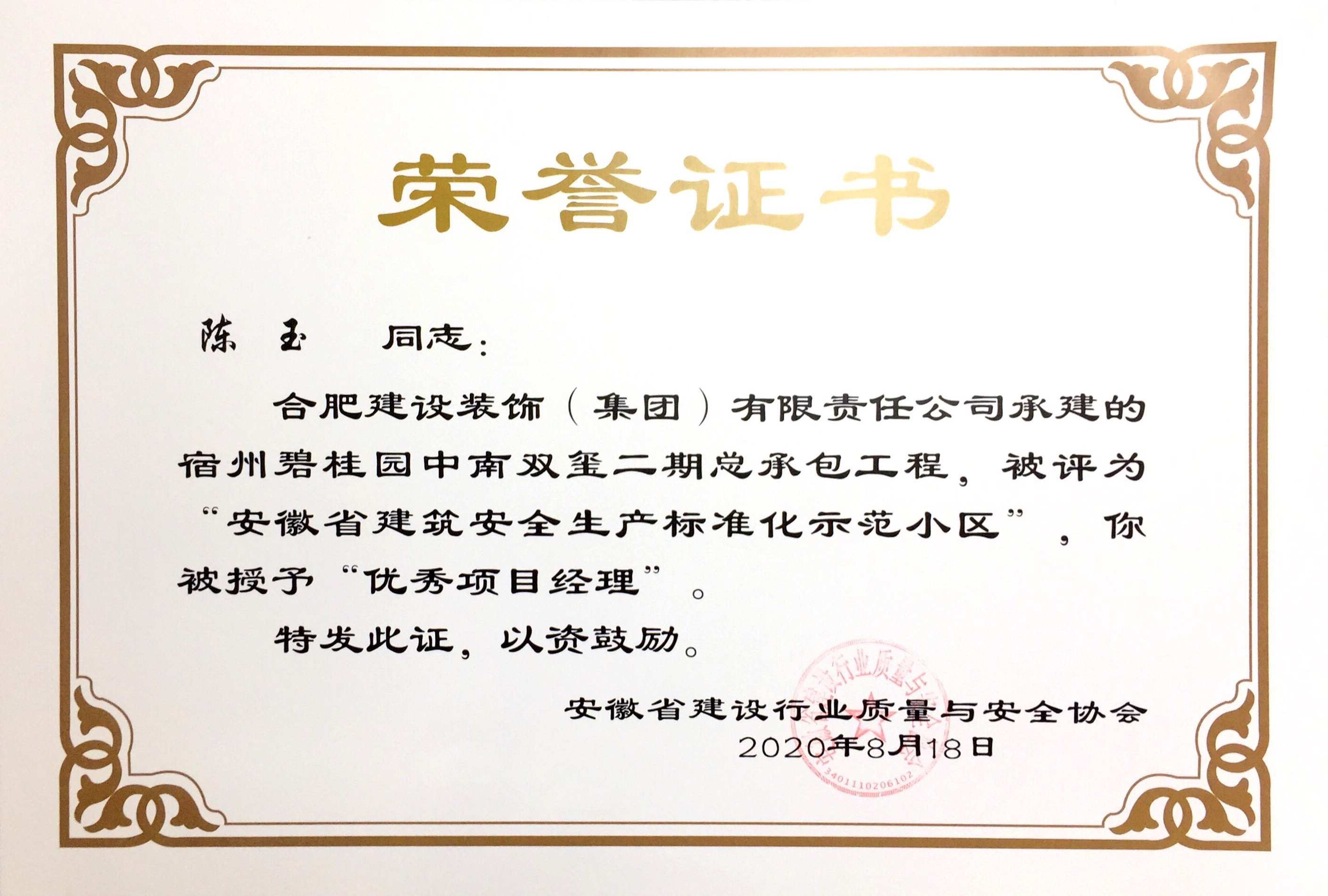 >宿州碧桂园中南双玺二期总承包工程——安徽九游老哥俱乐部筑宁静生产标准化示范小区优秀项目经理--陈玉