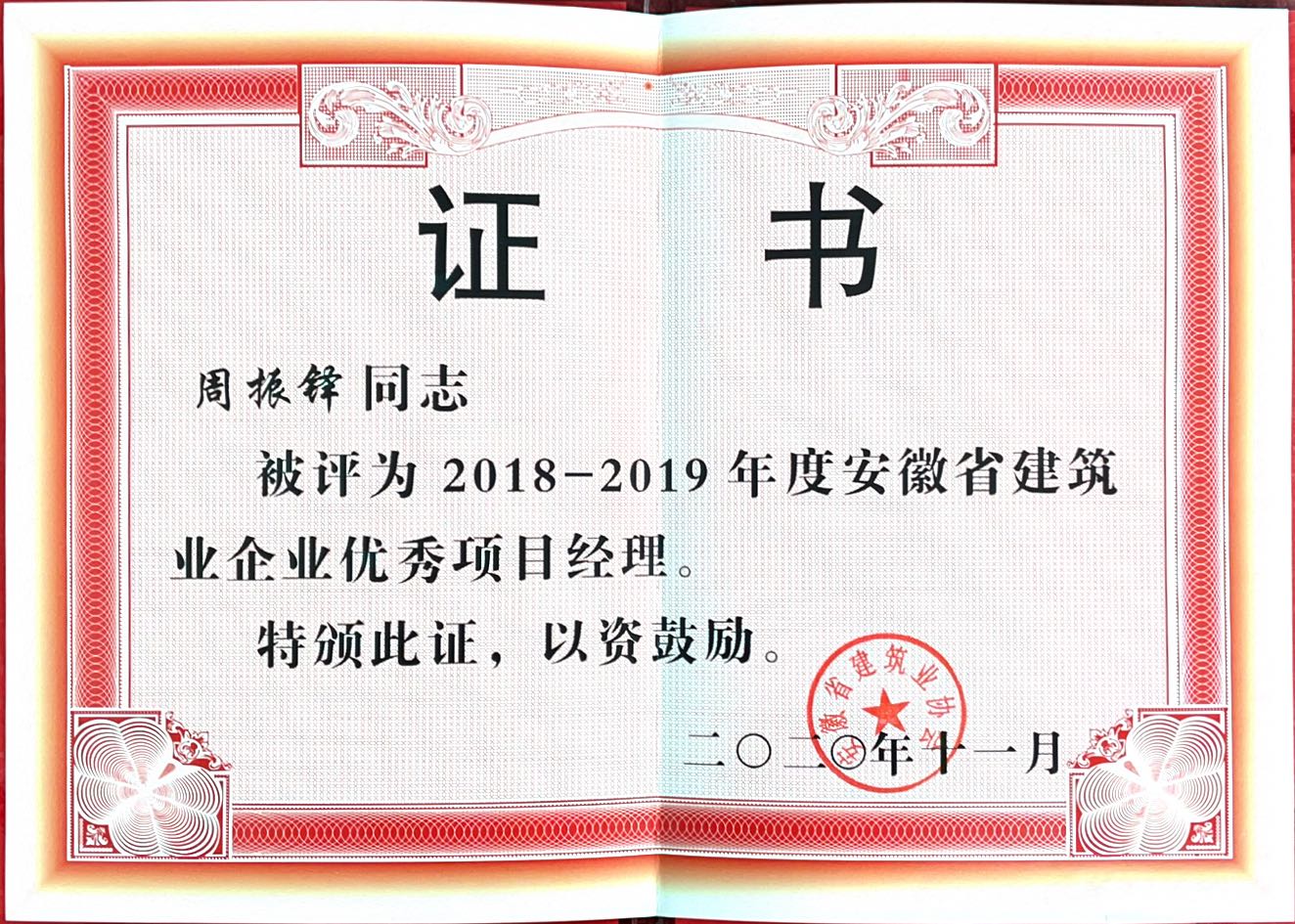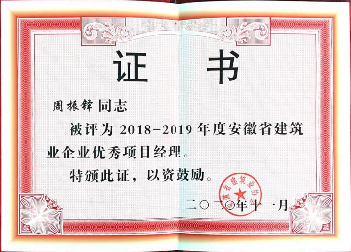 >2020年安徽九游老哥俱乐部筑业企业优秀项目经理--周振铎