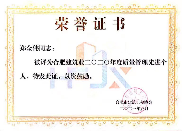 >2020年度合肥建筑业质量治理先进个人——郑全伟